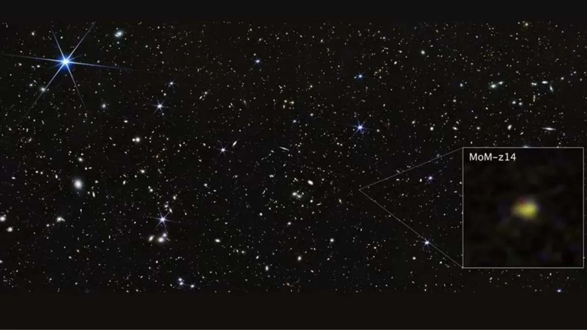 JADES-GS-z14-0, located approximately 13.4 billion light-years away, was observed as it existed just 300 million years after the Big Bang. This means that the light from this distant galaxy has taken 13.4 billion years to reach us, giving us a glimpse into the early stages of the universe.
