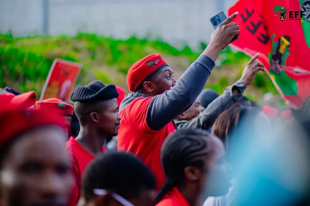 Thousands of EFF supporters have gathered in the city of Johannesburg to show their unwavering support for their leader, Julius Malema. The streets are filled with a sea of red as the passionate supporters chant and sing in unison, showing their dedication to the Economic Freedom Fighters (EFF) party.